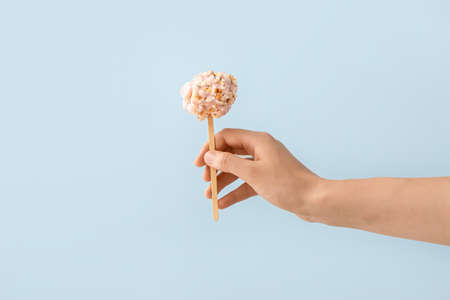 Woman holding bright delicious cake pops on color background, closeup. Space for text