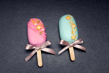Ball-shaped dessert with glaze. Pink and blue icing. Special recipe of cake pop. Nice surprise for your kid.