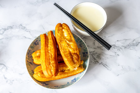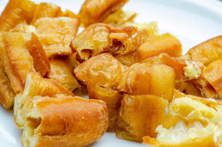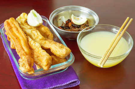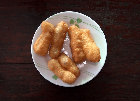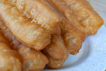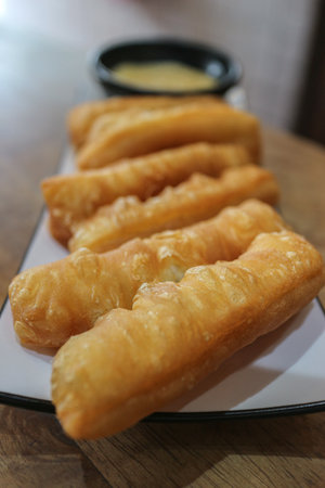 Chinese bread stick or chinese donut on dish. Breakfast street food usually eat with hot tea, coffee or soy milk.