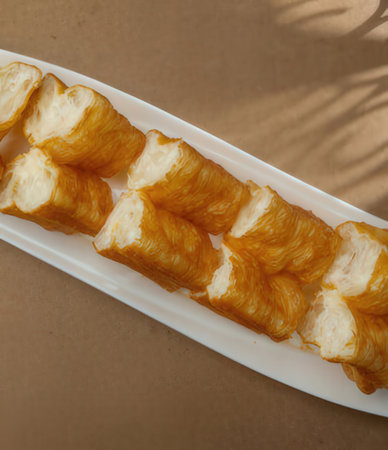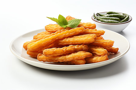 Close up of cakoi or Youtiao on white plate with customizable space for text. Asian food concept