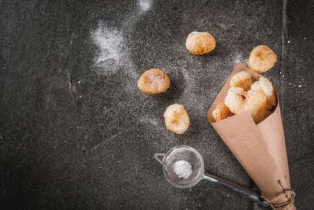 Homemade baking, puff pastries. Trendy food. Cronuts popcorn, puff donuts holes, in paper bag, with powdered sugar. On a dark stone table. Copy space top view