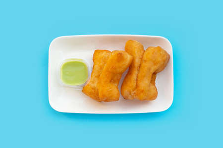 Deep-fried dough stick, chinese bread stick on white dish. Blue background with copy space