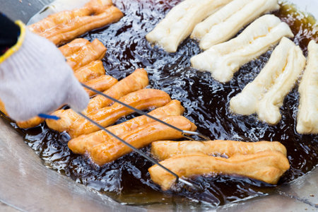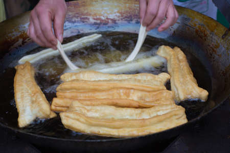 Chinese deep fried dough in hot oil on steel pan. Youtiao, Padnoongo or fried flour sticks is one of the popular breakfasts of Chinese pople, popular street food. Chinese style fried donut.