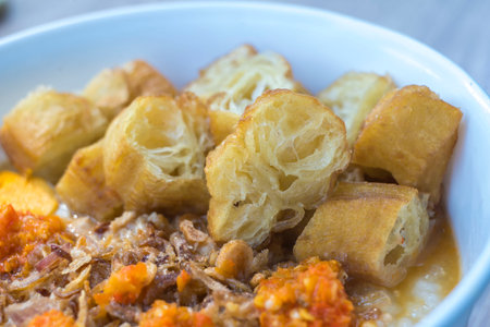 Bubur ayam or chicken porridge is a popular Indonesian breakfast porridge made with rice congee and topped with shredded chicken, half piece of boiled egg and spices.