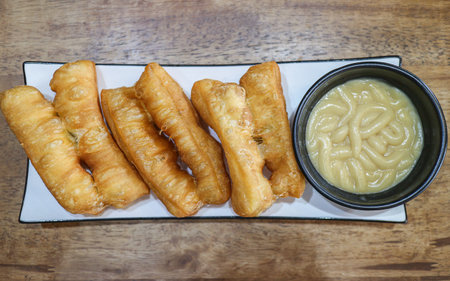 Flat lay of golden crispy Pa Thong Go, Chinese youtiao donuts with custard dip on wooden table, authentic Thai Chinese street food from Bangkok Chinatown.