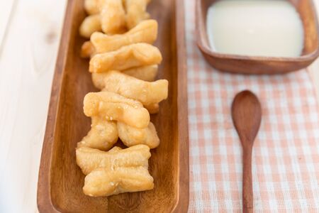 Breakfast : Deep-fried dough stick on the wood table with selective focus