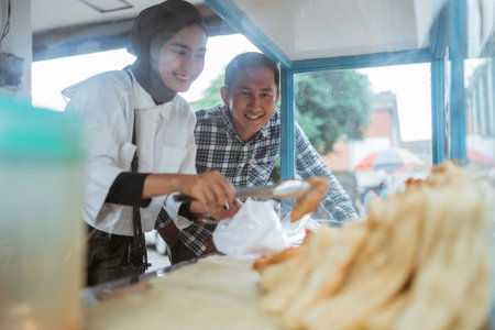 beautiful woman in hijab while sells various kinds of fried food with a cart on the side of the road