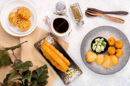 Fried Patongko placed in a white plate, breakfast served with hot black coffee on working desk
