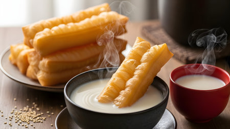 Freshly fried Chinese dough sticks, or Youtiao, are served with a bowl of hot soy milk. Steam rises from the warm milk and crispy golden pastry, creating a classic and appetizing Asian breakfast scene.
