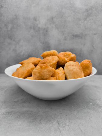 White bowl is brimming with golden brown puff puffs, boortsog, boorsok, a popular west african street food, ready to be enjoyed, copy space