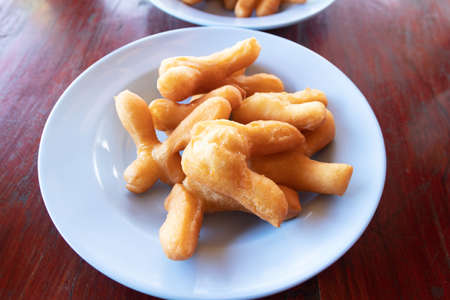 Thai deep-fried dough sticks served on white dish on wooden table as breakfast.