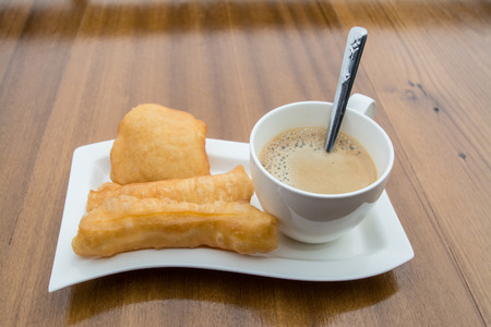 deep-fried doughstick and coffee on wood table,Thai breakfast