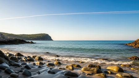 AI Generated. Beautiful coastal landscape with clear turquoise water and rocky shoreline under a bright blue sky