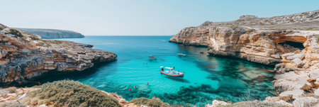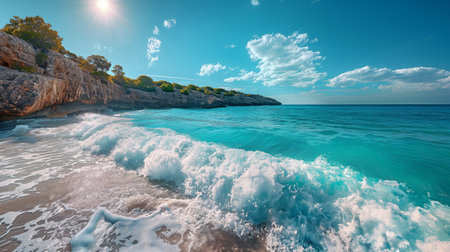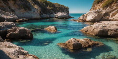 AI Generated. Clear turquoise waters and rocky cliffs along a serene coastline under a bright blue sky