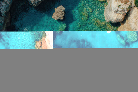 Summer seascape from above, showcasing a dramatic rocky shoreline and clear ocean water, great for travel brochures or beach-themed imagery.