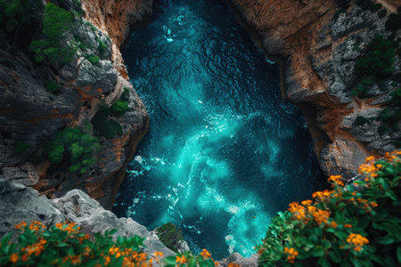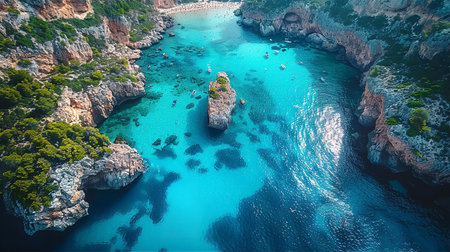 This photo captures an aerial perspective of a body of water encircled by rocky formations, Spectacular overhead view of a turquoise sea meeting rocky cliffs, AI Generated