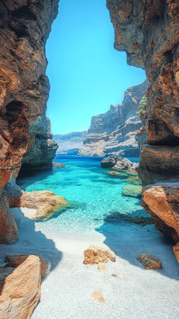 A secluded beach reveals crystal clear turquoise waters framed by rugged rock formations under a vibrant blue sky. Sunlight illuminates the sandy shore and tranquil sea inviting exploration.