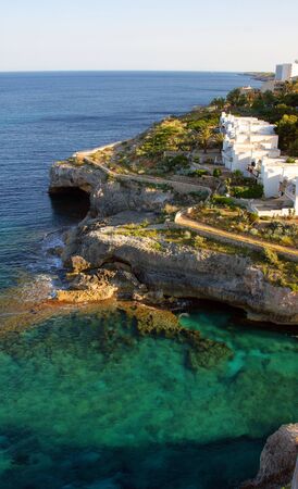 Areal view Island scenery, seascape Spain Majorca, beach bay Cala s'Almunia, beautiful coastline Mediterranean Sea. Balearic Islands, Cliff of Cala S'Almunia in Santanyi