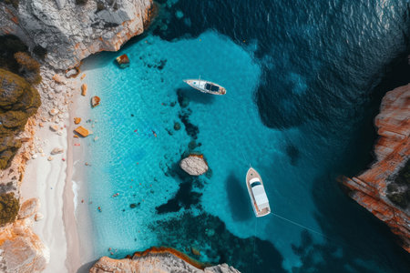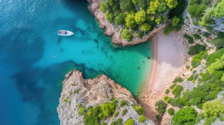 Aerial shot of a hidden beach cove with a boat in azure waters
