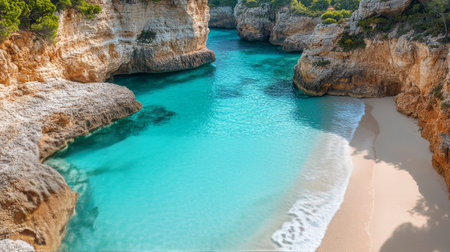 Turquoise bay surrounded by rocky cliffs and lush greenery with crystal clear Mediterranean waters. Majorca, Cala des Mora