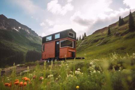 tiny house on wheels, parked in scenic mountain landscape, created with generative ai
