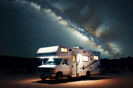 Illuminated van parked in a serene landscape at night, surrounded by stars, creating a peaceful atmosphere for adventure seekers