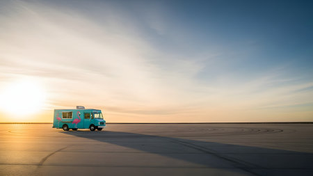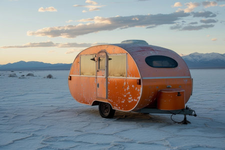 A stark trailer rests on a flat desert landscape, framed by a vivid, contrasting sky. Ideal for themes of exploration, solitude, and modern design.