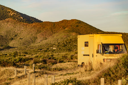 Camper car rv camping on coastal nature, Spain Murcia region, Calblanque Regional Park.