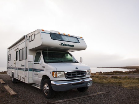Bonneville, Utah, USA-August 5, 2015. Driving motorhome on Bonneville Salt Flats, Utah.