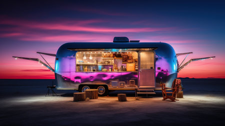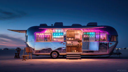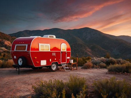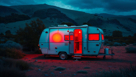 Vintage caravan illuminated with red light parked in a desert landscape under a dramatic twilight sky creates a surreal and evocative scene. Ai generated image