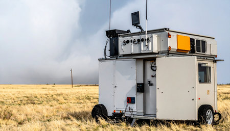 A state-of-the-art mobile research laboratory stands ready in a vast, open field, its advanced instruments pointed towards a dramatic, cloud-filled sky. This self-contained unit is deployed for on-site atmospheric data collection, crucial for weather forecasting and climate studies.