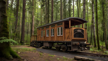 An old, orange train car, heavily rusted and overgrown with lush green vines, sits abandoned in a forest. Nature reclaims the forgotten vehicle, creating a scene of decay and resilience.