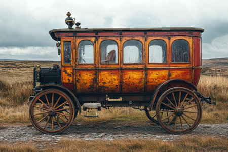 A vintage horse drawn carriage stands on a gravel path surrounded by rolling hills and cloudy sky evoking a sense of nostalgia.