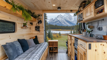 Natural light is filling the interior of this cozy camper van, showing off its rustic aesthetic