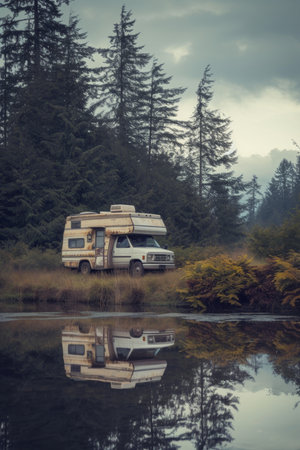 Scenic view of a modern trailer parked beside a tranquil lake at sunset, surrounded by lush trees and a serene atmosphere.