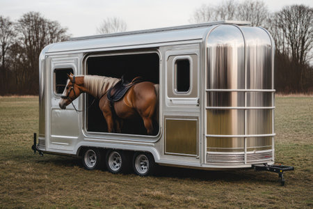 Trailer designed for safely transporting a horse, showing secure interior setup and equine travel on the road.