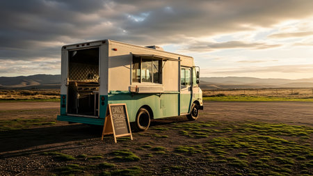 A vintage-style mint green and white food truck is parked in a wide open rural landscape under a dramatic sunset sky. A chalkboard sign advertising Daily Specials stands nearby suggesting a remote or festival catering setup.