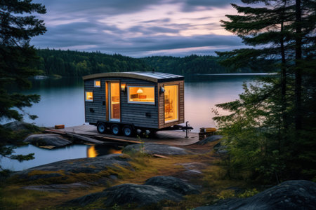 Mobile House stands against lake and mountains view. tiny house embraces the adventurous