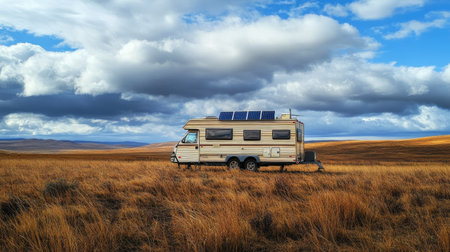 A caravan with rooftop solar panels set up in a remote location, with a dramatic cloudy sky overhead.