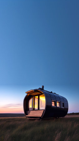 A stylish modular tiny home with large glass windows, set in an open field during a peaceful evening. The vertical composition makes it perfect for social media reels and stories
