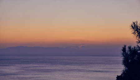 Sunset visible from a hill, light reflected in the water of Mediterranean sea in Cinque Terre, Italy