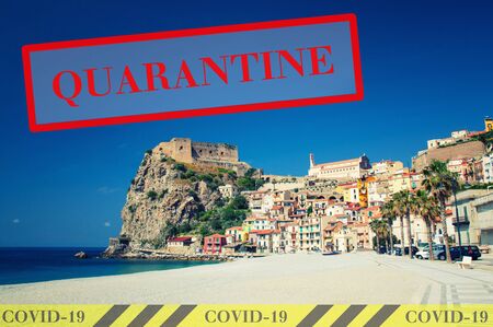 Quarantine in Italy. Scilla town with old medieval castle on rock. No travel and lockdown concept. Coronavirus outbreak Covid-19 pandemic concept. Canceled tourist vacation. Yellow black tape.