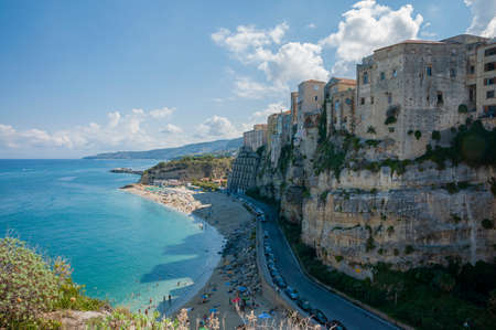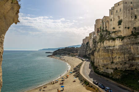 Tropea, Italy - September 10, 2019: Landscape with Tropea beach and old town buildings on mountain rock.