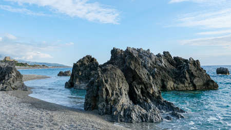 Scalea beach, Calabria region. Rocky formations at the beach. In the background, on the left, the Talao tower.