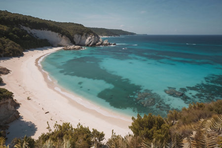 AI Generated. Clear turquoise waters and rocky cliffs along a serene coastline under a bright blue sky