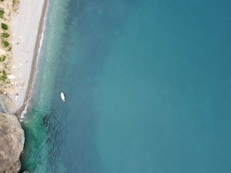 Aerial view of a canoe in the water floating on a transparent sea. Bathers at sea. Parghelia, Tropea, Calabria, Italy. Diving relaxation and summer vacations. Italian coasts, beaches and rocks.