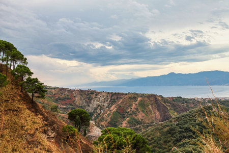landscape illuminated by morning sun near Reggio di Calabria with island of Sicily and Mount Etna, Italy