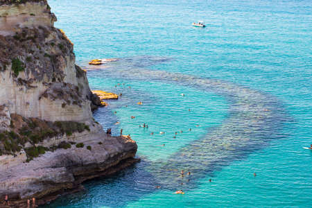 Aerial view of Tropea beach, crystal clear water and rocks that appear on the beach. Calabria, Italy. Swimmers, bathers floating on the water. Tyrrhenian Sea. Coastline of Calabria