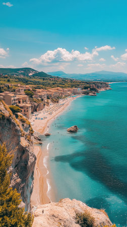 Discover the stunning coastline of Sperlonga, where golden sandy beaches meet crystal-clear waters, enhanced by charming coastal homes and a vibrant sky.