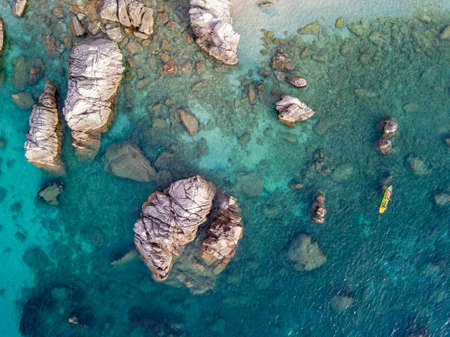 Aerial view of the rocks on the sea. Overview of seabed seen from above, transparent water. Swimmers, bathers floating on the water